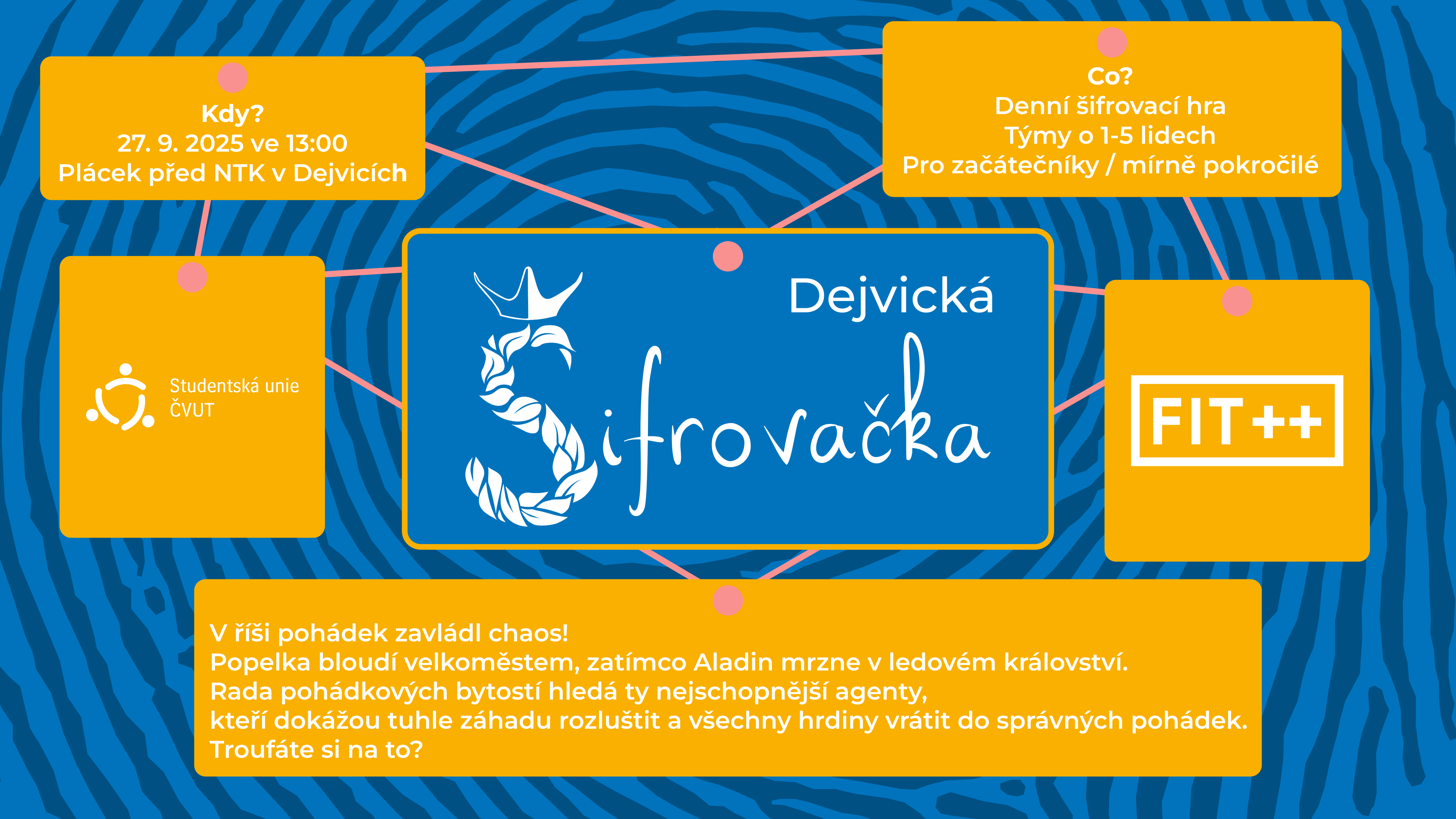 • Je povoleno si hledat informace na internetu, ne však ptát se kamarádů přes internet na řešení. (Výjimky se udělují pro členy týmu, kteří se nemohou účastnit prezenčně - musí být však na šifrovačku přihlášeni stejně jako ostatní)